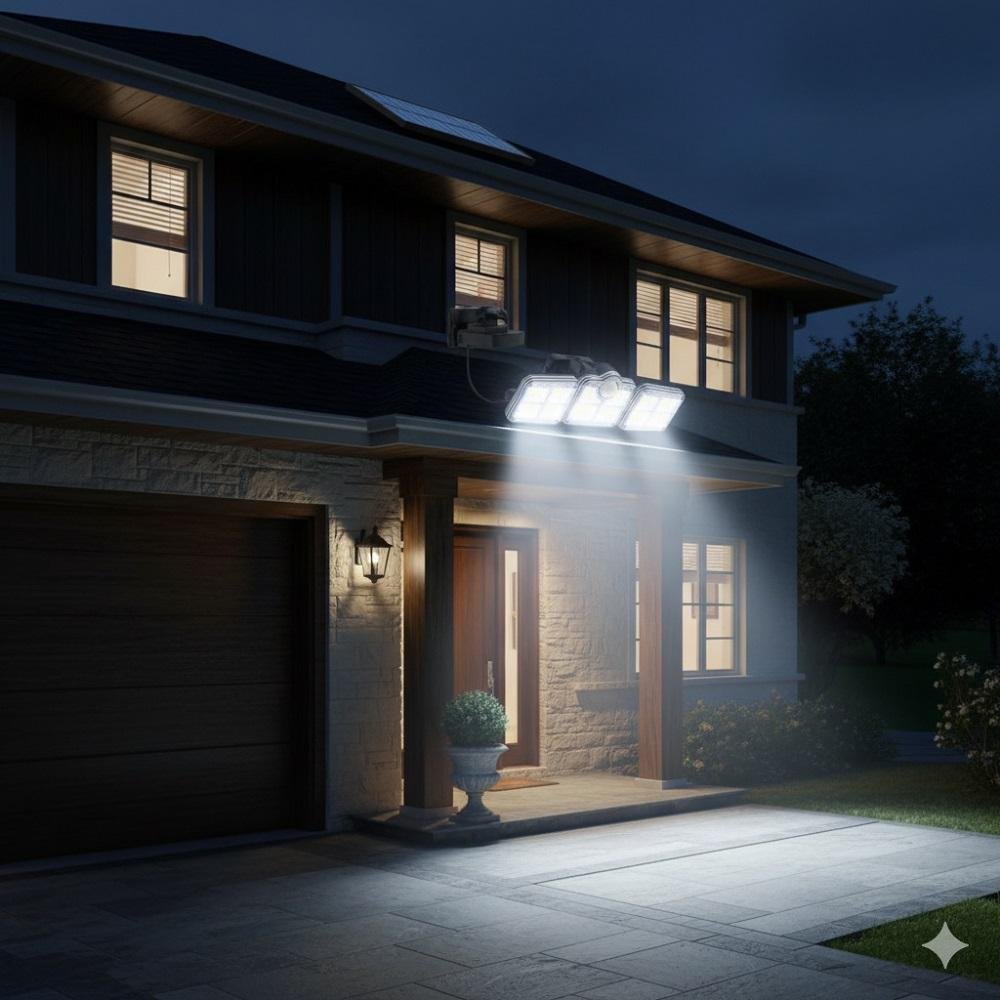 El diseño de tres cabezales ajustables ofrece un amplio rango de cobertura lumínica, ideal para patios, entradas, terrazas, estacionamientos o jardines. Gracias a su sensor de movimiento PIR, se activa solo cuando detecta presencia, brindando comodidad, seguridad y eficiencia energética.